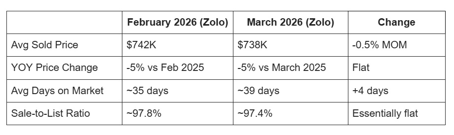 What this tells you: prices have barely moved month-over-month, which might sound like good news — but flat isn't recovery. We're still sitting 5% below where we were a year ago, and homes are taking slightly longer to sell as spring inventory starts to build. The sale-to-list ratio holding near 97–98% tells you the same thing it did in February: when homes are priced right, buyers are still showing up. They're just not overreaching.